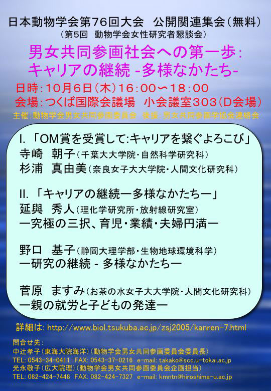 「男女共同参画社会への第一歩:キャリアの継続 - 多様なかたち(第5回 動物学会女性研究者懇談会)」