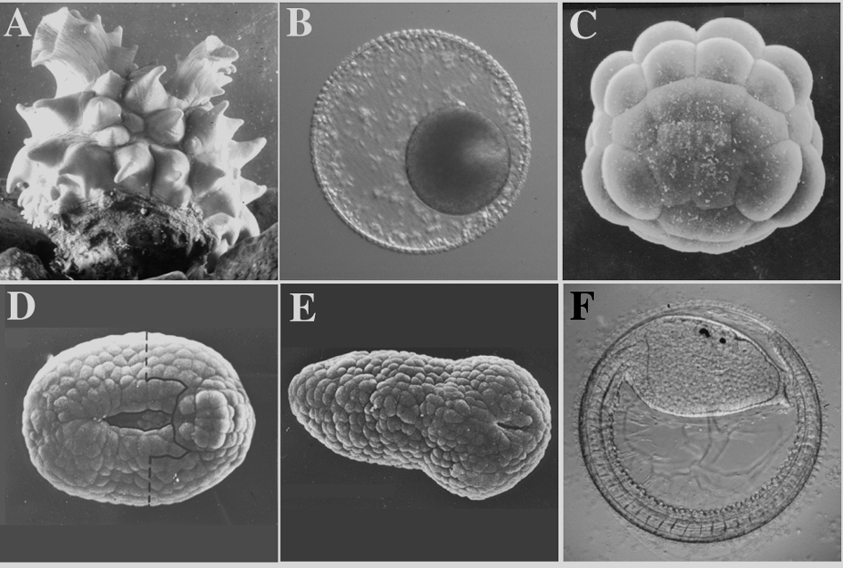図1 マボヤの発生 A: 成体(受精後3年)。大きさは15cm位。沼宮内隆治氏(青森大学)の好意による。B: 受精卵。直径は280 μm。C: 64細胞期。すなわち、卵が6回分裂したところ。D: 神経胚。中枢神経系の前駆細胞が胚の中に入ろうとしている。右が前側。E: 尾が伸び始めたところ。ごつごつしているのが一つ一つの細胞である。構成細胞数の少なさがわかる。F: 孵化直前のオタマジャクシ幼生。受精後35時間。幼生は、約3000個の細胞でできている。西田、沢田(2002)より。
